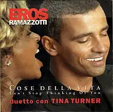 The track was re-recorded by Ramazzotti and American singer and actress Tina Turner, and re-released in December 1997 as a single from Ramazzotti's first greatest hits compilation album, Eros. This time the song was bilingual and retitled "Cose della vita (Can't Stop Thinking of You)". The additional English lyrics were by Turner herself and James Ralston. The re-release was accompanied by a music video shot in September 1997,[20] and directed by Nigel Dick.[21]
