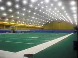 Cost Sports Center is 62 feet (19 m) high and houses a regulation football field that can be converted into nine tennis courts or four indoor soccer fields.[3] It features locker room facilities and a catwalk for filming or viewing practices.[1] Originally the primary indoor practice facility for the University's football team,[4] since 2000 the football program has taken up primary residence at the UPMC Sports Performance Complex on Pittsburgh's South Side just across the Monongahela River from Pitt's campus.[5] Prior to the opening of the UPMC Sports Performance Complex, the Cost Sports Center was also occasionally used by the Pittsburgh Steelers as an indoor practice facility.[6][7] The Cost Center currently serves as an indoor practice facility for the Panthers' varsity baseball, softball, soccer, and track and field teams during inclement weather.[8][9] It also is the site of the annual Blue and Gold inter-squad track and field meet.[10] The baseball team has utilized it for workouts, batting practice, and to host winter Diamond Baseball Clinics,[11] but has moved some activities into its new facilities across the street at the Petersen Sports Complex. The Cost Sports Center is also used by other varsity and club sports, as well as for intramural activities.