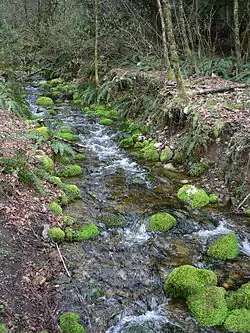 The hilltops of Cougar Mountain form a rough horseshoe-shape around the Klondike Marsh headwaters of Coal Creek, which runs northwest to Lake Washington through Coal Creek Park. Long Marsh Creek, Far Country Creek, Cabbage Creek, and Wilderness Creek are tributaries of May Creek, draining the south side of Cougar Mountain to Lake Washington. Deeply etching the sandstone precipice on the north and east side, Lewis Creek, Kline Creek, AA Creek, West Tibbets Creek, and Claypit Creek carry their water to Lake Sammamish.