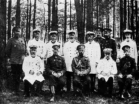 Council of Ministers in the Tsar's Headquarters, Baranavichy station, June 14, 1915. In the first row: state controller Peter Kharitonov; Grand Duke Nikolai Nikolaevich; Nicholas II; Chairman of the Council of Ministers Ivan Goremykin; Minister of the Imperial Court and destinies, Adjutant General Count Vladimir Frederiks. In the second row: the Minister of Internal Affairs, Prince Nikolay Shcherbatov; Minister of Railways Sergey Rukhlov; Foreign Minister Sergey Sazonov; chief administrative officer of land management and agriculture Alexander Krivoshein; Minister of Finance Peter Bark; Chief of Staff of the Supreme Command, General of Infantry Nikolay Yanushkevich; Infantry General Alexey Polivanov; Minister of Trade and Industry Prince Vsevolod Shakhovskoy