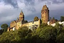 Frederik's sons Diederick I of Isenberg, (1215–1301) and Frederik junior who died as a teenager, were brought up at the ducal court by their uncle Hendrik. At a young age they fought with the support of knights of their uncle to reclaim lost property. Diederick built a wooden fort and nearby a stone castle as a support point on the Schleipenberg (near Hagen Germany), the castle Hohenlimburg named after his mother's family. In 1241–1242 he built a second castle New Isenberg opposite the town of Werden on the river Ruhr. On May 1, 1243, he was formally recognized as count of part of his father's recaptured territory. Until then he call himself 'Van Isenberg' later on Diederick I of Limburg (1215–1301). Diederick's son, Johan died at the age of thirty and left two sons and one daughter. [17] His younger brother Everhard continued 30 years more, the struggle together with his father for the conquest of former Isenberger family property.