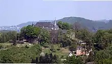 Hermann II, also known as Pusillus, Count Palatine of Lothringen, was count of the Auelgau, Bonngau, Keldacha and Zulpichgau. He fought in the battle of Lechfeld 955. Pusilus, married around 985 for the second time N.N. and died 16 July 996.[5] Two sons are known from that marriage, Herman (III), Count of Keldachgau and Adolf I, defensor Tuitiensis guardian of Deutz.[6] Both mentioned in charters between 1003 and 1041. Adolf I, fifth and youngest son of Herman II was also mentioned Advocadus. On the river Duhn, in the middle of the former Ezzoner Keldachgau, about 30 km east of Cologne, Adolf built castle Berg near today's Altenberg. He was the youngest (half-brother) of Ezzo, founder of Brauweiler Abbey, who was brother-in-law of Emperor Otto III, married to Mathilde. She was brought up by her older niece Abbess of the monastery of Essen, who also named Mathilde . The famous Mathilde cross, kept in the Abbey Essen, is a reminder of her. Adolf in turn was a brother-in-law of the youngest Mathilde, Abbess of Essen. The Ezzoner Adolf I is the direct ancestor of the later Counts and Dukes of Berg. He was followed by his son Adolf II mentioned in charters in 1041, count in the Keldagau en Bruckterau.[7] Married a daughter of count Heinrich II of Westphalia and died approx. 1091. Their son Adolf III called himself Count of Monte (Berg)[8] He is known as Adolf I of Berg, mentioned in charters 1077–1082 Vogt in Gerresheim, Werden, Deutz and Berg.[9] He married a daughter of count Dietrich I of Cleve and died approx 1082. With him the house of Berg starts.