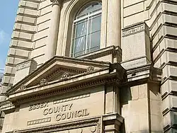 By the late 1920s it was clear that further expansion was needed. The properties in King Edward's Street were demolished and the most imposing part of the new county hall complex, a building clad in Portland Stone on the corner of Duke Street and Threadneedle Street known as Block C, designed by J. Stuart, was built between 1929 and 1939.[1] The design featured a main entrance at the south east corner of the building facing Market Road; there was a doorway on the ground floor flanked by Doric order columns supporting an entablature with a pediment above; there was a round headed window on the first floor flanked by Corinthian order columns and there were smaller windows on the floors above.[1] A geometric pattern was carved into the stonework above the doorway; this subsequently led to controversy as the carving was capable of being interpreted as a line of swastikas.[8][9] Internally, the principal rooms were the council chamber, the committee room and the council chairman's room which were all fitted out at the expense of the businessman and philanthropist, Sir William Courtauld.[10] The council chamber in the new building was formally opened on 23 September 1938.[11]