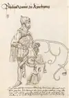 • Conrad of Kirchberg: Konrad is shown on the miniature 24r of the Codex Manesse as a knight (Graue Chunrat vo Kilchberg) who is giving his beloved a poem on horseback. 22 stanzas have survived, divided into three summer and three winter songs, which are reminiscent of Neidhart and Tannhäuser in terms of motif and form.[7] The historical person is uncertain; it is either Konrad (documented between 1255 and 1268) or his son of the same name (documented between 1286 and 1315).[7]