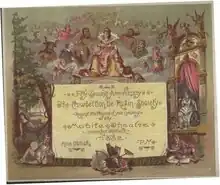 The Cowbellions got their start when a young merchant and cotton factor from Pennsylvania, Michael Krafft, began a parade with rakes, hoes, and cowbells.[2] The Cowbellions introduced horse-drawn floats to the parades in 1840 with a parade entitled, "Heathen Gods and Goddesses.[3][4]