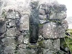 The surviving remains of the hall consist of a rectangular structure on a north-west to south-east axis with a central division that suggest two phases of construction as one half has walls that are narrower than the other. A dominant feature in the northern section is a fireplace with a substantial lintel, the remnants of window locations are discernible.[28] Pink harling was evidently used.[29] Prominent slots feature in the southern section of the surviving building may have been used for timber beams hinting at a cruck and thatched roof on a single storey building.[30]