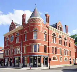 The Cox Building is a historic building located in Maysville, Kentucky, United States. Brothers George L. and William Hopkinson Cox began construction of the Richardsonian Romanesque structure at Third and Market Streets in 1886 and completed construction the following year. The project also included the construction of seven contiguous brick homes extending south along the east side of Market Street to Fourth Street.[2]