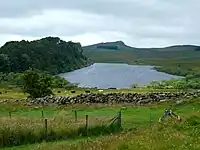 Crag Lough is an inland lake at the southern edge of Northumberland National Park, 2.5 miles (4.0 km) north of Bardon Mill, and 0.5 miles (0.8 km) north of the B6318 Military Road in Northumberland, northern England. At this point Hadrian's Wall is at the top of a line of crags, the Whin Sill, with Crag Lough at the foot of the crags.[1][2][3]