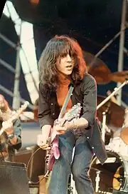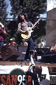 Chaquico's first guitar was a Winston acoustic which his mother bought for him when he was 10 years old after he'd given up his parents' idea that he would play an accordion.[23] He played a '57 Les Paul Goldtop on the first two Jefferson Starship albums and tours, Dragon Fly (1974) and Red Octopus (1975), on such songs as "Miracles".[7][24][25] He also soon added a rare '59 Les Paul Sunburst to his collection which he played on the next two albums, Spitfire (1976) and Earth (1978) and can be heard on such songs as "With Your Love", "Count on Me", and "Runaway".[25][26][27] Both Les Paul Guitars and the Bassman amps, along with several other valuable guitars, were stolen and/or destroyed in a riot in Lorelei, Germany, in 1978, when Grace Slick was unable to perform and the show was cancelled.[28][29][30] Into the '80s, Chaquico was sponsored by Carvin Guitars and often appeared on tour, in the studio and in guitar magazine ads playing a Carvin V220 or a Carvin koa doubleneck played through Carvin amplifiers, his favorite being the Carvin X100B.[31]