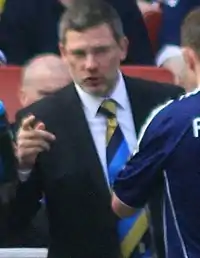 During his tenure, United regularly finished in the top half of the Scottish Premier League. The club reached the 2008 Scottish League Cup Final, which United led twice before losing to Rangers on a penalty shootout. Levein signed a new contract with United in December 2008,[13] but he left the job in December 2009 to become Scotland national football team manager. United went on to win the 2009–10 Scottish Cup under his successor Peter Houston, who had been Levein's assistant. Levein overhauled the club's youth system,[14] which subsequently brought through players such as Ryan Gauld and John Souttar.[15]