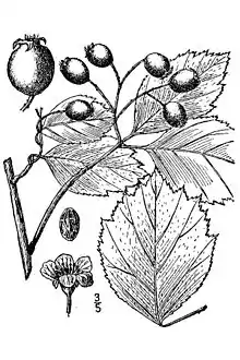 Crataegus douglasii is a compact erect bushy shrub growing to 8–9 metres (26–30 feet) tall with a trunk of up to 10 centimetres (4 inches) thick.[3] It is covered in fan-shaped green leaves about 2.5–5 cm (1–2 in) long[3] with teeth along the distal margin. Thorns along the branches are 1–2.5 cm long.[3]