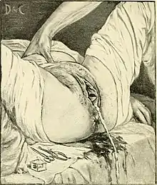 The Credé maneuver is a technique used to void urine from the bladder of an individual who, due to disease, cannot do so without aid. The Credé maneuver is executed by exerting manual pressure on the abdomen at the location of the bladder, just below the navel.[1] Patients can learn to perform the maneuver on themselves as it is simple to do.[2][3] The method is also used in obstetrics to aid the body in expelling the placenta after childbirth.[4]