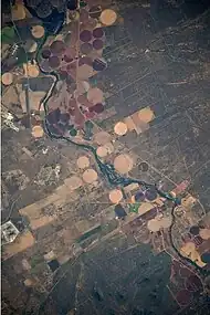 In Limpopo province, about 35 km further, the river passes the town of Thabazimbi and meanders for many miles through a sparsely inhabited area before joining the Marico River just west of Rooibokkraal at the limit of North West province to form the start of the Limpopo River.[4]