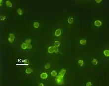 - ↑ Cevallos AM, Bhat N, Verdon R, et al. (September 2000). "Mediation of Cryptosporidium parvum Infection In Vitro by Mucin-Like Glycoproteins Defined by a Neutralizing Monoclonal Antibody". Infect. Immun. 68 (9): 5167–75. doi:10.1128/IAI.68.9.5167-5175.2000. PMC 101770. PMID 10948140.