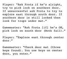 Players begin by generating a character with various attributes including Constitution, Intelligence, Dexterity, Charisma, Luck, Perception, and Strength.[3] Players could choose three skills which included: "Map reading, Traps/Maze, Language, Diplomacy, Swim, Animal/Bird, Boat/Fish, Mineral/Gem. Climbing, Gambling, Survival, Armor, Shield, Axe, Armor Repair and Weapon Repair".[7] Players had two character types available, warrior or wizard, assigning one as dominant.[4] Players advanced levels by amassing experience points and testing at their guild in a walled city.[8] Turn orders were simple: players wrote orders in sentence form for the gamemaster (image right).[6]