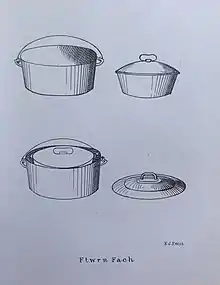Freeman notes that the old varieties of bread from Wales were mostly rough or coarse varieties that were made with flours from whole grain, barley meal, oatmeal or rye. Bread was usually baked in a wall-oven, which was specially heated for the day, or in a bread-oven housed in a separate small building of its own, near to the house. In areas where peat provided fuel a large cast-iron pot with a lid, similar to a Dutch oven and known as the ffwrn fach, would be used to bake bread. The ffwrn fach would hang on a tripod over a peat fire indoors. The inside of the pot was greased and the dough placed inside.