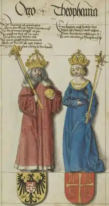 There is discussion regarding whether her title coimperatrix and the power associated with it were the result of Frankish and Saxon traditions or Byzantine influence.[2] On one hand, it seems the portrayal of a female counterpart to an imperator or emperor had Byzantine origins,[3] her education blended Byzantine and Ottonian element with some authors such as Simon MacLean opine that the Ottonian court played the main role. Harper Norris notes that, "The Ottonians were a Saxon dynasty, and the grants of land two years into her consortship highlight that Theophanu was being vested with power as a Saxon ruler, connecting her to the rest of the Saxon line".[4]