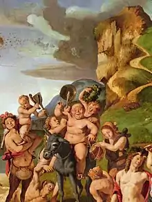 Due to its widespread domestication and use, the donkey is referred to in myth and folklore around the world. In classical and ancient cultures, donkeys had a part. The donkey was the symbol of the Egyptian sun god Ra.[1] In Greek myth, Silenus is pictured in Classical Antiquity and during the Renaissance (illustration, left) drunken and riding a donkey, and Midas was given the ears of an ass after misjudging a musical competition.[2]