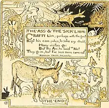 Donkeys were featured in literature during the 20th century, including in George Orwell's 1951 Animal Farm, where Benjamin the donkey is portrayed as a resilient and loyal friend to Boxer the horse, as well as being wise, but he is also shown to be cynical about change and, like Eeyore, is resigned to his lot not improving.[15] Puzzle is a well-meaning but easily manipulated donkey in C. S. Lewis's 1956 The Last Battle.[16] Brighty is the central character of the 1953 children's novel and 1967 film Brighty of the Grand Canyon. Donkeys are portrayed in film including the 1940 Disney animated films Fantasia and Pinocchio, where the Coachman and his henchmen turning boys into donkeys in Pleasure Island, and in the segment of Beethoven's Symphony No. 6, also known as The Pastoral Symphony a unicorn donkey named Jacchus with Bacchus and is attacked by Zeus.[17] A donkey is featured as the main figure in the 1966 film Au hasard Balthazar by Robert Bresson, and, is given a life path of Christian symbolism.[15] The major character Donkey, voiced by Eddie Murphy, features significantly within the Shrek film franchise.[18] The logo and brand identity of popular YouTuber Videogamedunkey features a cartoon donkey.[19]