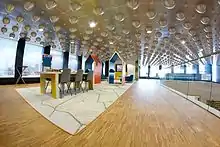 The front of the building has three cantilevered sections which hang over a plaza entrance. The structure houses a library, a school of the arts, and large exhibition spaces. On the first floor of the building there is a 5500 m library: considered one of the most beautiful of the 154 libraries in the Netherlands.[5][6] Each of the cantilevered sections is used for different departments: music, arts and theatre. Community archives are found in the center of the building.[5]