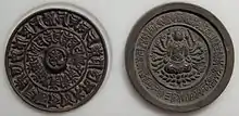 The backs of a pair of bronze mirrors showing Cundi, one with a Sanskrit inscription in Ranjana script, and one with a Sanskrit inscription in Chinese script. Yuan dynasty (1271–1368). Held at the Capital Museum, Beijing.