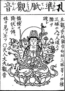 Cundī Esotericism was also widely practiced by Chinese Buddhist laypersons during the Ming. In P'eng Chi-ch'ing's (1740-1796) biography of lay Buddhists, the most popular mantras among laypersons were the Cundī mantra and the Great Compassion Mantra.[24] She is also prominent in the art of the late Ming, such as in the paintings of Chen Hongshou (1598–1652).[21] The popularity of Cundī Esotericism among the laypeople in the late Ming is also attested by German Jesuit Athanasius Kircher (1602-1680) who included an illustration of the deity in his famous China Illustrata (1667).[23]