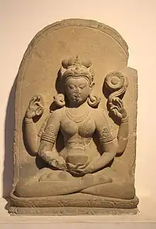 The name Cundī (along with other variations like Cundā, Cundrā, Candrā, Caṇḍā, and Cuṇḍrā) refers to an Indian Mahayana Buddhist deity found in numerous Indian sources such as the Śikṣāsamuccaya, Cundādhāriṇī Sūtra, Sādhanamālā, Niṣpannayogāvalī, Mañjuśrīmūlakalpa and the Guhyasamāja.[8][4] Conze notes that the Tibetan terms for the goddess may go back to the Sanskrit: Cundī, Caṇḍī (a name for Durga), Cunda, Chundi, or Cuṇṭi.[4] Benoytosh Bhattacharyya argues the correct Sanskrit name should be Cundā.[8]