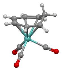 The compound is a piano stool complex, consisting of Mo(CO)3 bound to six carbon centers of the triene. The methylene group projects from the plane of the six coordinated carbon atoms.[3]