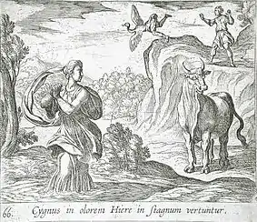 Ovid also incorporates the story of Cycnus and Phylius in his Metamorphoses: in his version, Phylius performs the three tasks but refuses to deliver the tamed bull to Cycnus. The latter is scorned and throws himself off a cliff, but transforms into a swan as he is falling and flies away. His mother Hyrie, unaware of the transformation and thinking that he is dead, dissolves away in tears, thus changing into the lake Hyrie.[2]