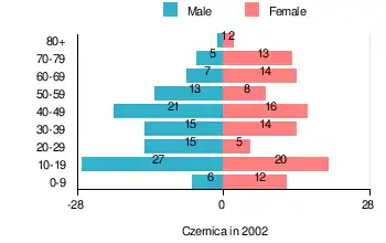 According to the 2002 Poland census, there were 214 people residing in Czernica village, of whom 51.4% were male and 48.6% were female. In the village, the population was spread out, with 27.1% under the age of 18, 36.4% from 18 to 44, 18.2% from 45 to 64, and 18.2% who were 65 years of age or older.[1]