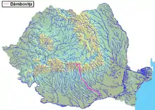 The Dâmbovița (Romanian pronunciation: [ˈdɨmbovitsa] ⓘ) is a river in Romania.[1][2] It has its sources on the Curmătura Oticului, a mountain pass that separates the Iezer Mountains from the Făgăraș Mountains proper. It passes through Bucharest and flows into the river Argeș near Budești, in Călărași County. Its length is 286 km (178 mi) and its basin size is 2,824 km2 (1,090 sq mi).[2][3] Dâmbovița County is named after the river.
