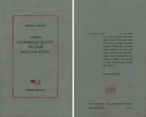 • Comme un morceau de nuit, découpé dans son étoffe (Like a swatch of night cut out of its own cloth), preface by Dominique Sorrente, Cheyne publisher, coll. Grise, Chambon-sur-Lignon, France, 2010.