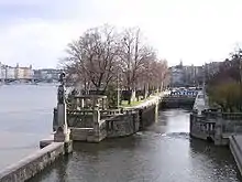 The present-day segmented foot-bridge to the island was built in 1933. It is built on supports originally constructed for a proposed bridge from Myslíkova street (Jiráskův Bridge).