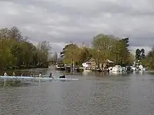 The wooded island is 145 metres in length, and apart from its two points, 30 to 45 metres in width.[1] It is 16.8 miles (27.0 km) from Charing Cross, London.[2][1] Weybridge is the parish[3] and post town. Elmbridge and Surrey County Council are the district and county-level local authorities.[4]