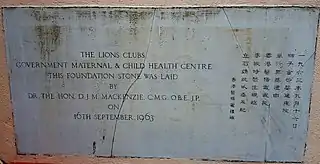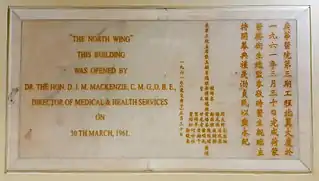 Another major objective of Mackenzie during his time as Director of Medical and Health Services was to rapidly expand public-health services to satisfy ever-increasing public demand.[34] Public hospital projects completed during his tenure included the large and modern Queen Elizabeth Hospital at King's Park, which was opened on 10 September 1963,[34] and the North Wing of Kwong Wah Hospital at Yau Ma Tei on 30 March 1961.[35] Other public-health-development projects completed during his tenure included the Sandy Bay Infirmary (now Tung Wah Group of Hospitals Fung Yiu King Hospital) in December 1962 and the Kowloon Rehabilitation Centre in August 1963, etc.[36][37] Furthermore, the foundation stones of Tsuen Wan Adventist Hospital, Li Po Chun Health Centre and the Lions Clubs Government Maternal and Child Health Centre in Kowloon City were laid by him in June, July and September 1963 respectively.[38][39][40]