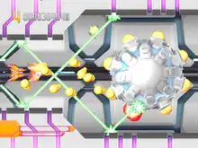 Influenced by Gradius and R-Type, DUX is a horizontally scrolling shooter that relies on tactics rather than fast reflexes. There are several powers the players can use, such as power pod (absorbing bullets while hitting the fire back), charge shot (doing maximum damage blows in a single wave), and onboard missiles (can be fired in any direction around the ship).[2] During the game, the main background can be adjusted in a menu, allowing for a clearer view.[3]