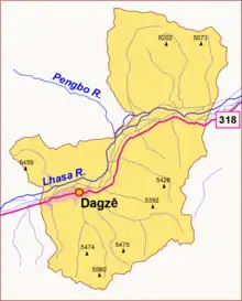 ![]() Location of Dagzê District (red) within Lhasa City (yellow) and the Tibet A.R. | |