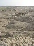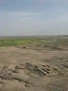 Dahan-e Gholaman is the largest Achaemenid site in all of eastern Iran.[2] Some 27 structures aligned roughly in a straight line running SW to NE along the northern edge of the site were excavated by the Italian archeologist U. Scerrato in 1962–1965 and by the Iranian archeologist S. M. S. Sajjadi in 2000–2005. Further geophysical and surface exploration in 2007–2011 revealed the outline of another monumental building situated 2 km south of the northern complex of buildings.[3] Several of the larger structures excavated or detected at Dahan-e Gholaman have regular rectangular or square plans and bear comparison with the palatial buildings and audience halls of the Achaemenid royal residences at Pasargadae and Persepolis, as well as Dasht-e Gohar.[4] One of the structures has been identified as a religious building, its three altars possibly dedicated to the leading Persian gods Ahura Mazda, Anahita, and Mithra.[5]
