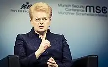 Dalia Grybauskaitė (Lithuanian pronunciation: [dɐˈlʲɛ ɡʲrʲiːbɐʊsˈkɐ̂ˑɪtʲeː]; born 1 March 1956) is a Lithuanian politician who served as the eighth president of Lithuania from 2009 to 2019. She is the first woman to hold the position and in 2014 she became the first President of Lithuania to be reelected for a second consecutive term.[1][2]