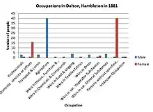 In 1881 the dominant occupation was in agriculture with 40 males in that profession. In 2011 this had changed to 32 males becoming Managers, Directors and Senior Officials in Dalton.[9] In 1881 the main profession for females was domestic services or offices, by 2011 this had changed to 16 women being Managers and Senior professionals.[10]