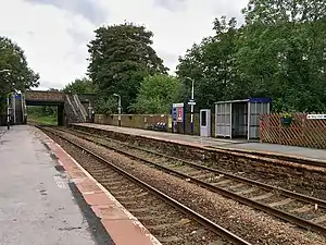 The station is unstaffed, with a card-only ticket machine on the southbound side; passengers have to obtain a promise-to-pay notice to pay by cash on board the train.[5] Digital signs and timetable posters are provided on each platform for train running information purposes. The station buildings are no longer in rail use, though shelters are located on each side. Access to the platforms is either via steps from the over bridge at the south end or via paths from adjacent public roads (the latter are step-free).[6]