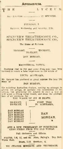 - ↑ ""DAN MORGAN" AT THE LYCEUM-HALL". The Daily Telegraph. No. 9980. New South Wales, Australia. 23 May 1911. p. 9. Retrieved 21 November 2023 – via National Library of Australia.