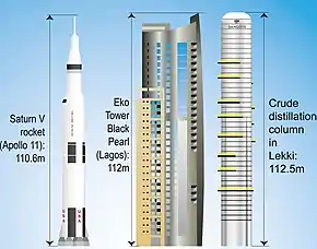 In 2019, the world's largest crude distillation column, weighing 2,350 tonnes, was installed in place at the Dangote refinery by a specialist Dutch company.[84] With a height of 112 metres it is slightly taller than the Saturn V rocket which brought the first man to the moon (110.6m) and 16 metres taller than Big Ben. In the same year, three more records were set when the world's heaviest refinery regenerator was installed[85][86] - having already been the "heaviest item ever to be transported over a public road in Africa" at a stately 3,000 tonnes and also being "the heaviest single piece of steel structure" of the world.[87][88]