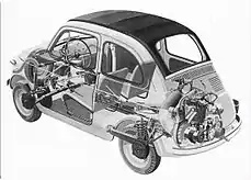 Next Giacosa and his team designed a replacement for the Fiat Topolino. The last version of the 500C had been discontinued the previous year 1954. The 600 was a totally new car, and for Fiat a new layout with the engine at the rear as well as unitary construction. When the 600 were introduced in 1955, rear-engined cars had been produced for well over a decade and their advantages and disadvantages by then well known. Giacosa used the advantages to produce a four-seat car, although with limited luggage space, that had a reasonable performance from an engine of only 633 cc, due to its low weight of 585 kg and also compact dimensions. Capable of almost 100 km/h (62 mph) and returning a fuel consumption of 16 to 20 km/L and the ability to cruise at 80 km/h (50 mph). He overcame the stability problems associated with other rear-engined designs by identifying that the problem was not the weight distribution of the cars, but the simple swing axle rear suspension used in those designs. His answer was to use a semi-trailing arm type of rear suspension that eliminated the large change in the camber of the rear wheels that was inherent with the simple swing axle suspension system.