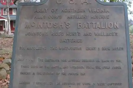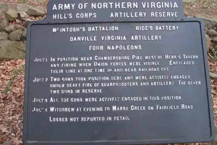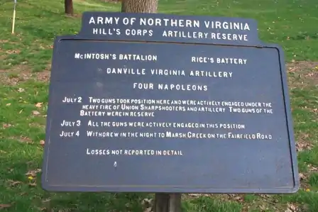 Danville Artillery (Rice's Company) Markers at Gettysburg National Military Park, located on Confederate Avenue, near the present-day Pennsylvania Army National Guard armory, on both sides of the road.