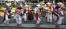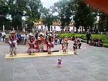 The Danza de los Viejitos is said have begun as a dance in the Mexican State of Michoacán in the Purépecha Region. The men that perform this dance are known as Danzantes or "Dancers." This dance was performed by four men that represent fire, water, earth, and air. Four dancers are also believed to be the correct number to dance in this traditional performance because there are four colors that make corn which is red, yellow, white, and blue.[1] The dancers ask El Dios Viejo (The Old God) for good harvest, communication with spirits, and to learn about the past or to predict the future.