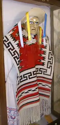 A Danzante wears a top and bottom made out of a white blanket. It is topped with a "sarape," which is a blanket worn as a cloak in Latin America. Each sarape contains different designs and colors. They wear a hat made out of straw with adorned lengthy pieces of ribbon, each one a different color. The ribbon is parted down the middle of the hat, each one hanging 10 cm on the sides. Their shoes are sandals that have a wooden sole in order to make a tapping noise throughout their dance, followed by a wooden cane they also use. The dancers also wear a mask made out of either wood, cornstalk paste, or clay with an elderly man's face painted on it.
