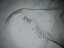 Abdomen with abdominal claw of a female: The two combs with a gap on the margin and the deeply nicked posterior margin are diagnostic of the species.