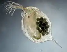 Daphnia magna is a typical water flea of the genus Daphnia. The females reach up to 5 mm in size, the males about 2 mm, thus they are among the largest species in the genus.[2] The body is protected by a translucent carapace made of chitin, a transparent polysaccharide.[3] It has a ventral opening and five pairs of thoracic limbs, used to help the filtering process.[4] Spike rows run along the back of the carapace. The intestine is hook-shaped and has two digestive ceca. The head has two antennae and a large compound eye.[5][6]