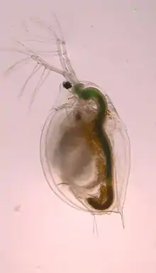Daphnia pulicaria have a translucent carapace and two prominent second antennae, which they use to move.[11] The carapace, composed primarily of chitin, helps protect the feeding apparatus, and it is periodically shed during an individual's life.[11] Daphnia have a compound eye, and they are known to have an optomotor response.[12] D. pulicaria generally have a body length less than 3mm.[3] Because of the clear carapace of Daphnia, it is possible to see the heart and digestive tract, which often appears to be green due to the consumption of algae.[11] The abdominal claw is also visible toward the end of the abdomen, and it can be used to dislodge any algae from the feeding apparatus if some begins to stick.[11]